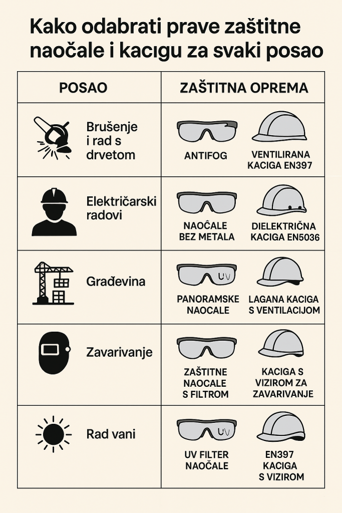 | Zavarivanje | Posebne naočale s filtrom | Kaciga s vizirom za zavarivanje |