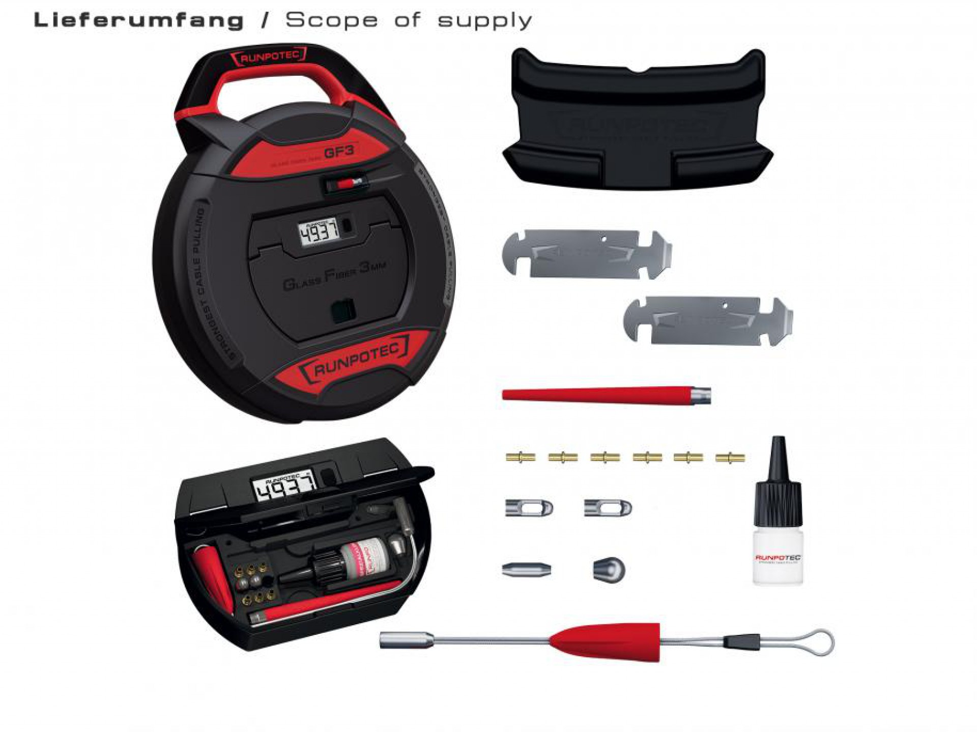 - GF3 – Alat za povlačenje kabela s uklj. digitalni brojačem, šipka od staklenih vlakana Ø 3 mm sa završnim spojem za zaštitu od pregiba (unutarnji navoj RTG Ø 6 mm) i patentirana glava za vođenje s podešavanjem uvijanja (2 x vanjski navoj RTG Ø 6 mm).