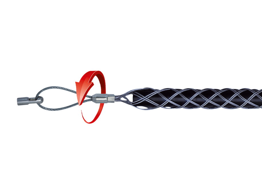 - Drška za povlačenje kabela (čarapa) s omčom i RUNPOTEC RTG Ø 6 mm navojem sa zakretanjem. Izrađen od fleksibilne žičane mreže od nehrđajućeg čelika. Ugrađeni zakretni element omogućuje okretanje kabela u cijevi, čime se sprječava odvrtanje navoja.