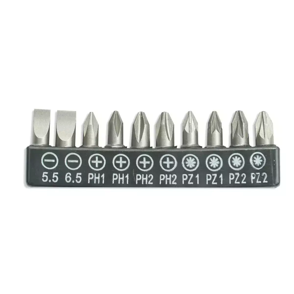 Set bitova za odvijače SL / PH i PZ. Vrhovi su izrađeni od čelika S2 koji se odlikuje visokom prokaljivošću i otpornošću na udarce. Zbog odgovarajućeg kemijskog sastava i toplinske obrade, bitovi dugo zadržavaju svojstva visoke čvrstoće.